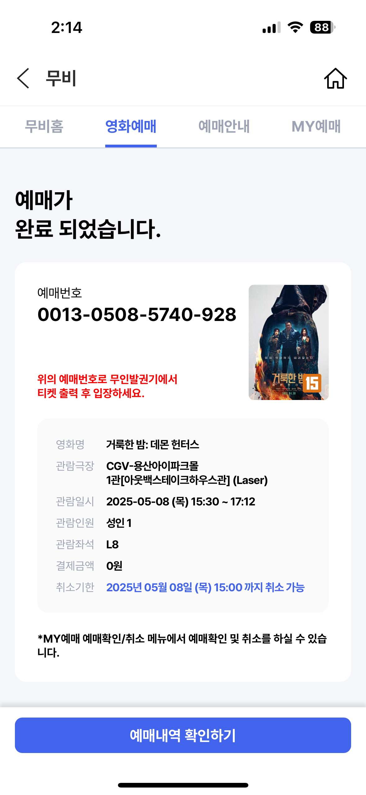 영화 티켓은 엄마꺼 하나 내꺼 하나 각각 무료로 한장 씩 예매해서